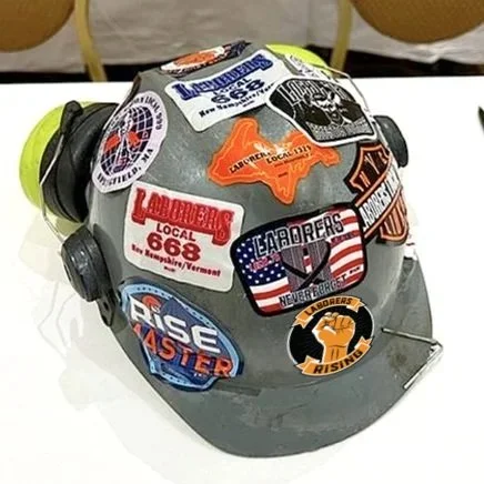 Feeney Brothers hard hat adorned with Union stickers.